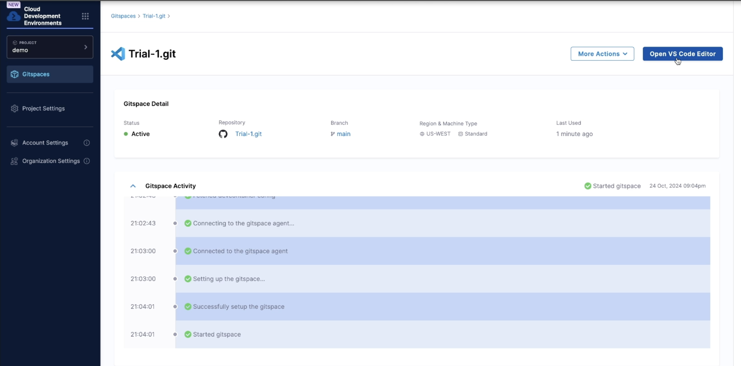 On-demand nature: Gitspaces can be launched anytime you want with a single click. If you’re working on multiple projects or need a fresh environment for any reason, you can get it instantly.