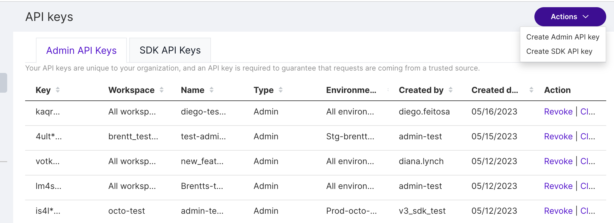 From the Admin API keys tab, click Actions and then Create SDK API key . The Create SDK API key view appears.