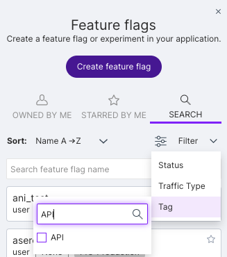 Use tags to organize and manage feature flags, segments, metrics, and experiments across the FME user interface. Tags can isolate a particular team or feature release, for example, reporting team, front end, or geo search release.