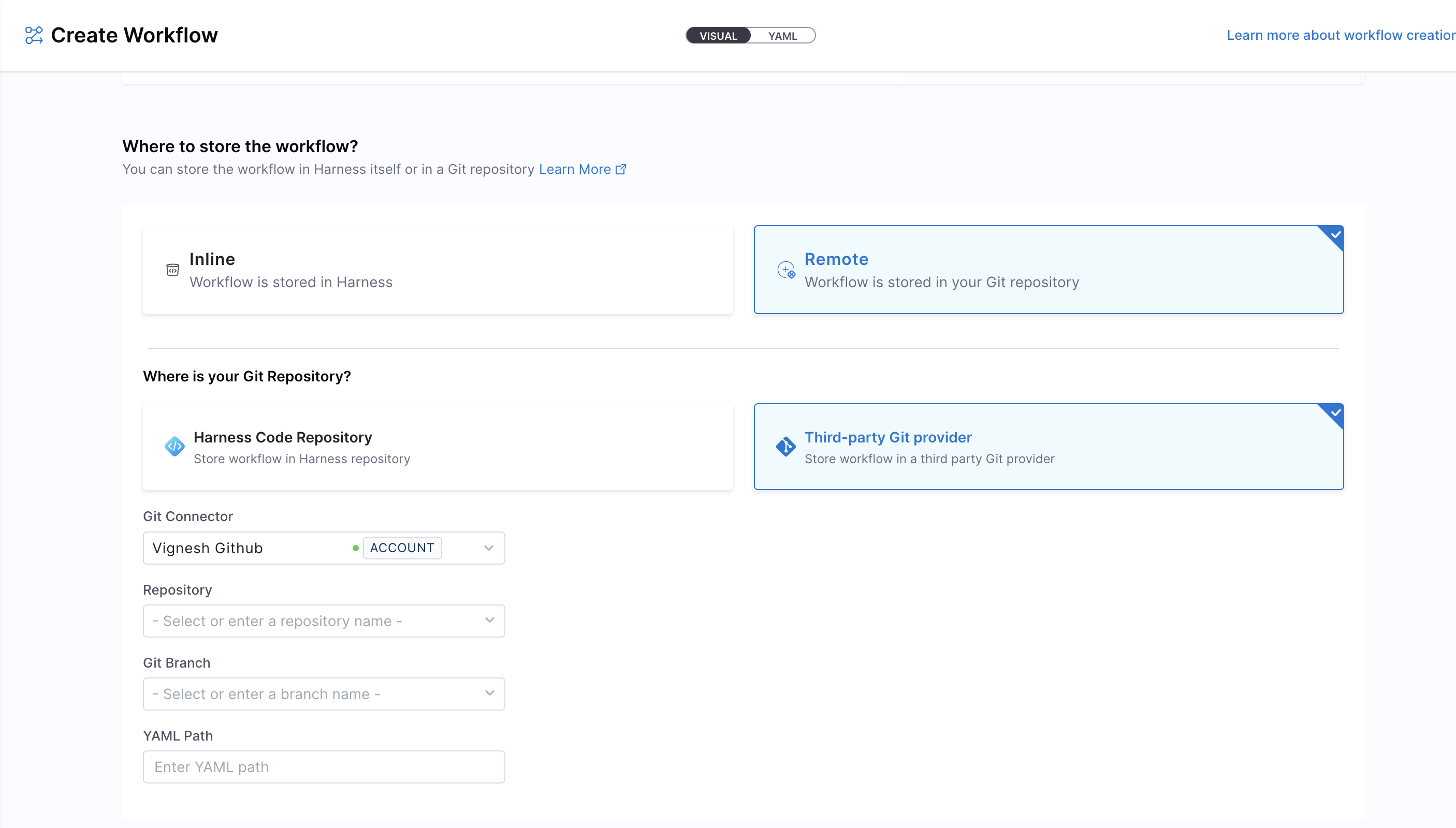 - Remote: Choose to store your Workflow YAML in a Git repository for version control, collaboration, and change tracking.