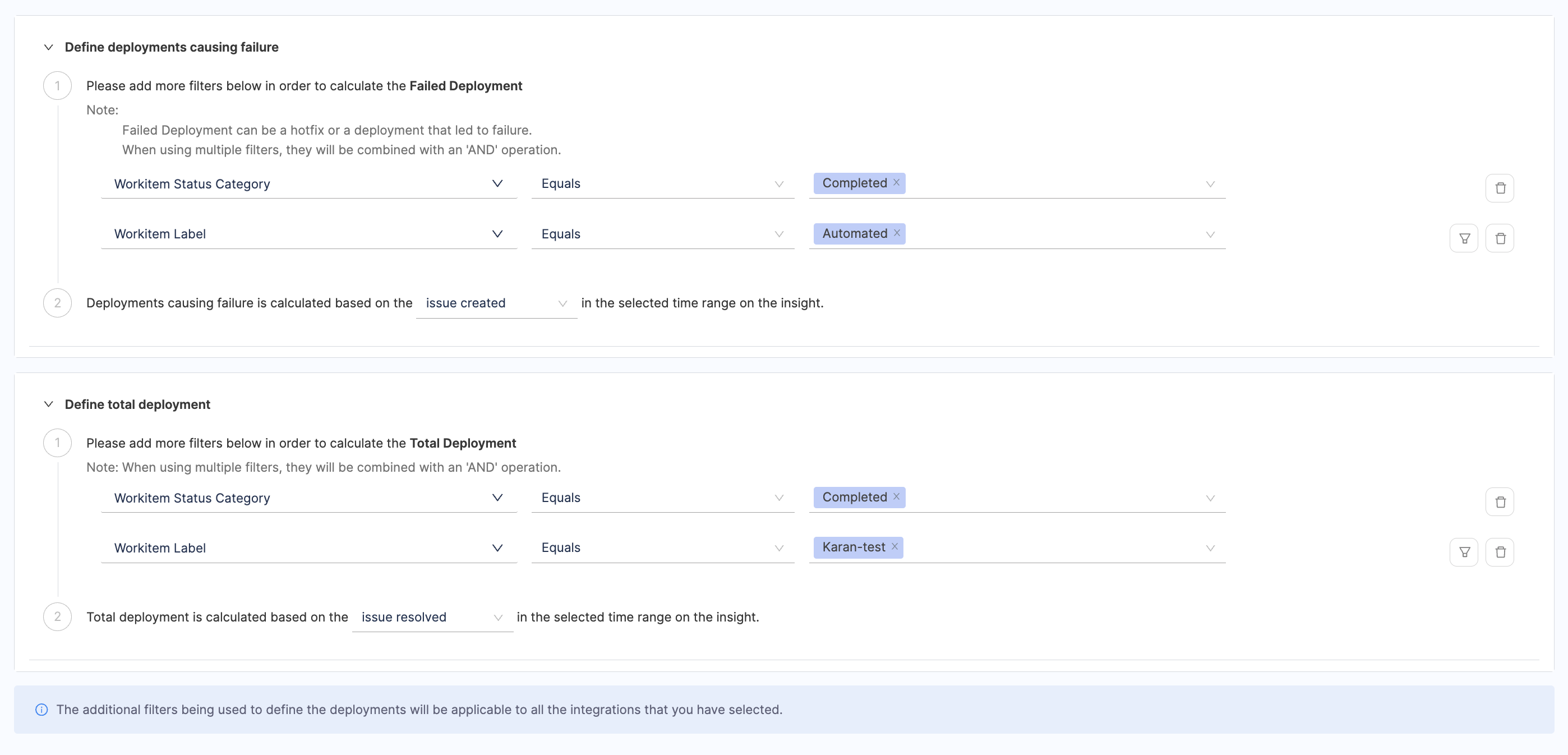 - Configure additional attributes to define deployments that result in failure or total deployments. When applying multiple filters, they will be combined using an 'AND' operation. A failed Deployment can be a hotfix or a deployment that led to failure.