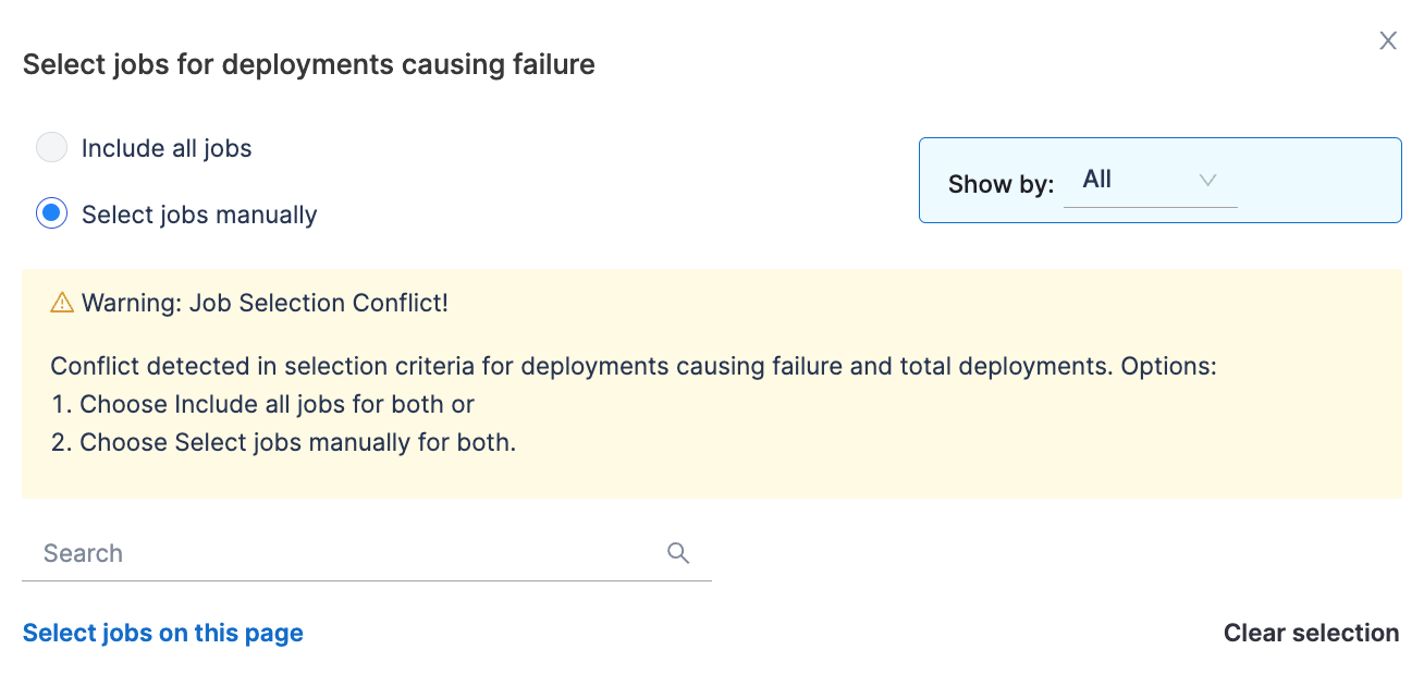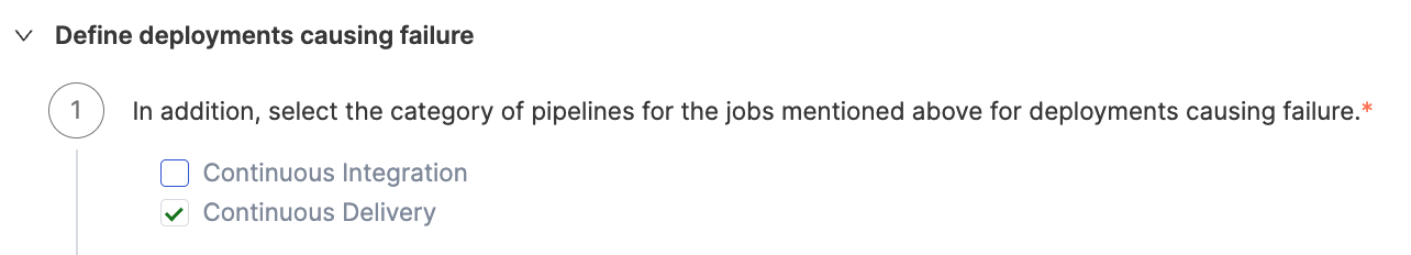 - Configure additional attributes to identify deployments that result in failure. By default, all pipelines are included, but you can customize the selection by manually specifying which pipelines should be included.
